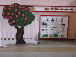La sezione Arancione si trova al piano inferiore, appena si entra si trova lo spazio “dell’albero” dove ogni mattina tutti in cerchio facciamo il calendario e vediamo chi è presente a scuola.